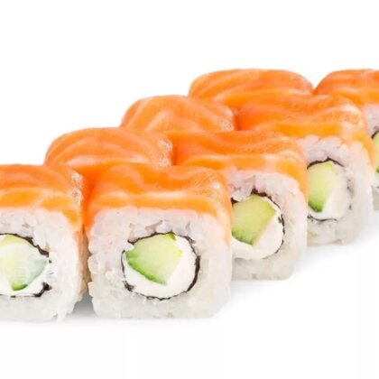 Креветка в темпуре, икра летучей рыбы, авокадо, лист